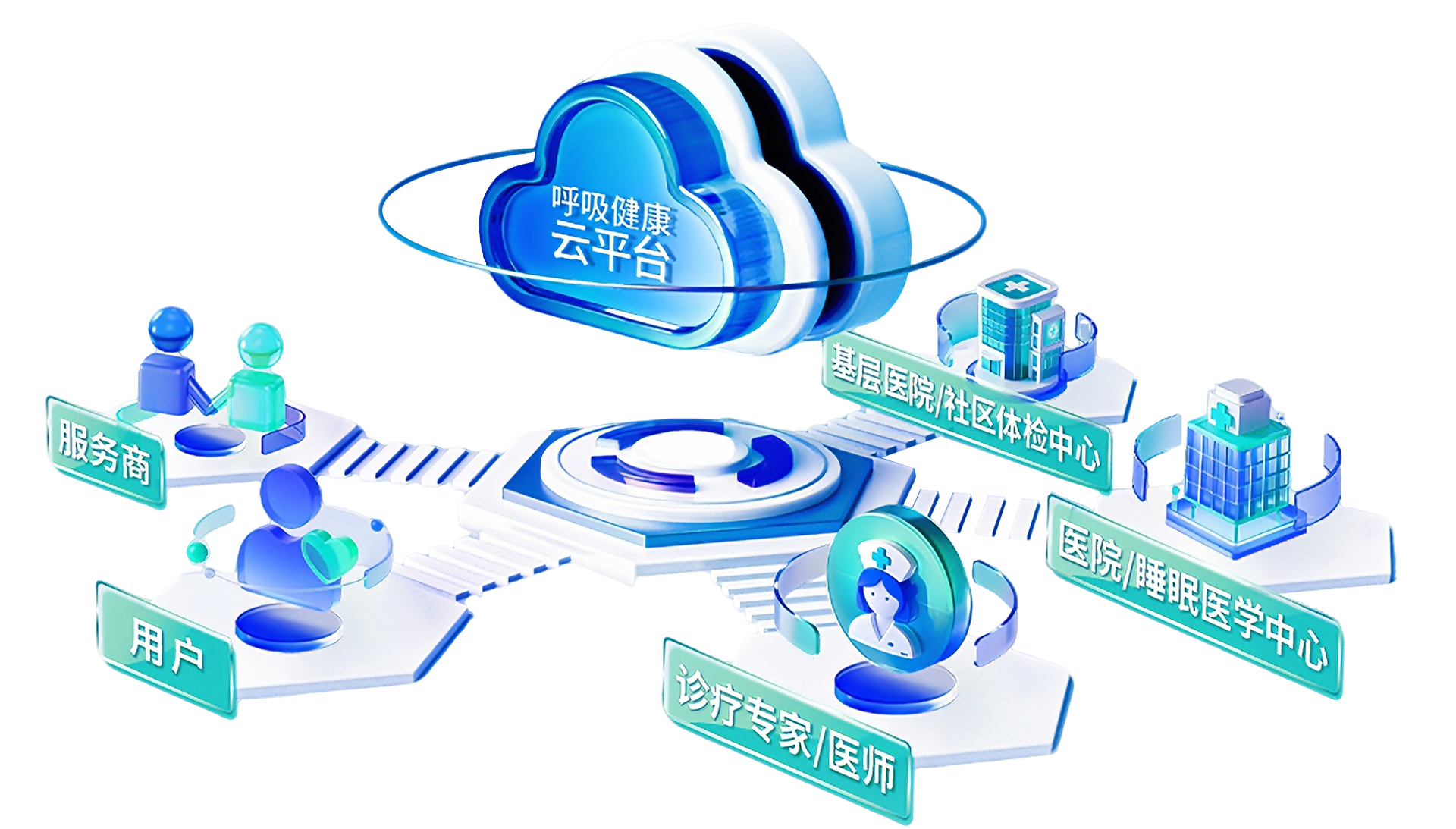 通过互联网云平台连接医生、用户、设备、客服等多端,实时上传用户使用数据,从用机数据、异常提醒,到医生诊疗、方案优化,打造完整链条,多方有效协同共同管理呼吸健康。